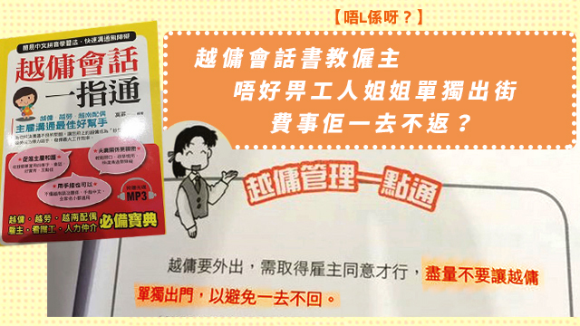 話說有位台灣網民喺書局買咗本叫《越傭會話一指通》嘅書,諗住學下點樣樣同越南工人姐姐溝通啦,點知愈睇愈唔對路……本書個封面又話「會話」又話「溝通最佳好幫手」呀咁,但入面竟然話「人性是經不起試煉的」,叫啲僱主唔好亂放貴重物品?