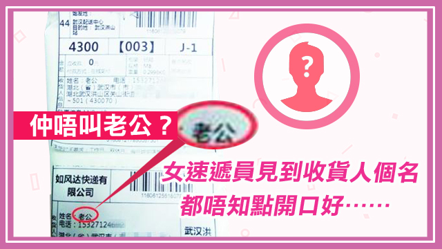 咦喂,點解收件人一欄寫住「老公」兩個字嘅?你咁樣寫唔怪得人哋冇叫過你個名啦,唔通真係叫你做老公咩~你就想喇!事後聽老婆講返,原來老婆曾經同過賣家講話「老公會來收貨」,所以賣家就寫咗收件人個名個「老公」喎……