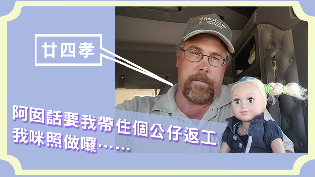 是咁的,話說佢囡囡不嬲都當呢個公仔係自己親生,好錫佢嘅。所以當佢知道個公仔話想跟老竇一齊坐貨車返工嘅時候(嗱唔好問毛毛點解個女仔會知道呀下),就即刻走去問老竇得唔得喇!