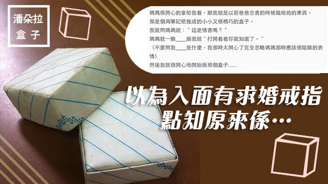 相信每個人嘅老豆老母都曾經有過一段值得令人啪啪啪晒手掌、可歌可泣嘅愛情故事,如果唔係都唔會生得你出啦係咪先!但都唔及呢位台灣網友嘅老豆老母纏綿,竟然玩到千里送條毛…唔係,係送個盒咁冤氣,唔通入面係結婚戒指嚟?