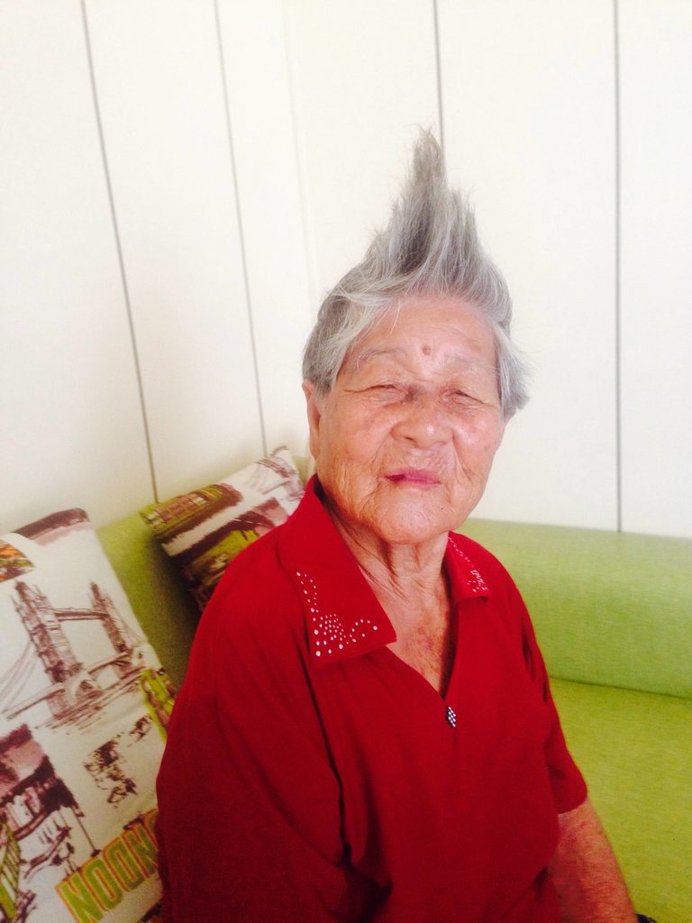其實呢位阿嫲除咗駕御到阿TOP型仔頭之外,連法式旋轉比比鳥頭look佢都carry到㗎!er……雖然就有啲似跳水板,但擺喺阿嫲個頭度,就即刻有陣潮味出咗嚟~