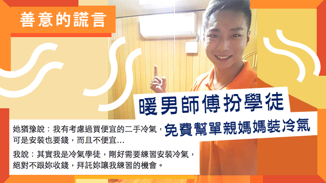 係,對大家嚟講,咁諗都好正常,不過對一啲低收入人士嚟講,想涼冷氣都唔係咁易。就好似呢位來自台灣嘅單親媽媽咁,佢一個人要照顧兩個囡囡,工作收入亦唔高,所以連想喺屋企裝部冷氣都負擔唔起……不過,台灣勝在有呢位好人到爆嘅水電「學徒」。