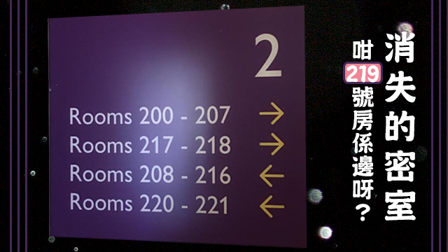 話說佢哋係住219號房嘅,咁上到2樓嘅時候例牌都要望下個指示牌,睇下自己間房喺邊面㗎嘛。但點知搵咗好耐都唔見有219號呢間房,唔通係酒店搞錯咗?定係佢哋其實係被選中嘅兩公婆,要入住呢間消失的密室呀下?