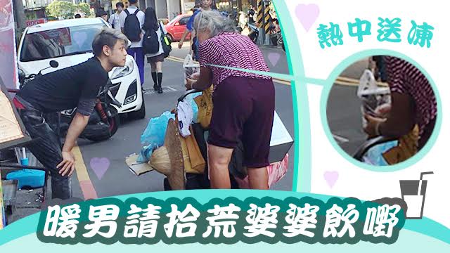 講笑啫~其實呢個哥哥仔係暖男一枚!佢見而家天氣咁熱,就請呢位路過嘅拾荒婆婆飲杯凍嘢喇~仲好細心咁烏低身同婆婆傾偈?呀,杯嘢飲係冰冰凍,但婆婆個心一定好warm啫!