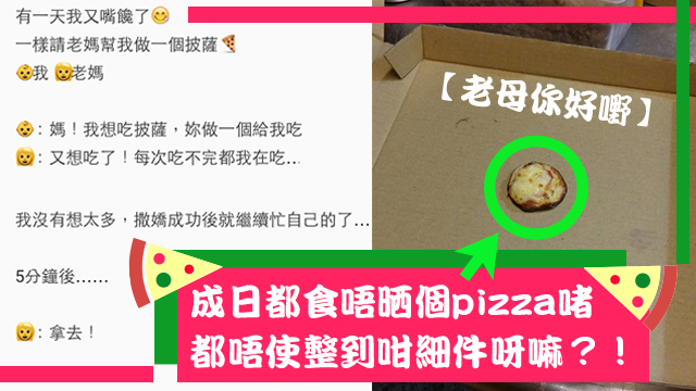 話說呢位網友成日眼闊肚窄,叫老母整大大個pizza之後又食唔晒,正一大㗰鬼!呢一日,呢位網友又重施故技,叫佢老母整塊pizza佢食,結果佢老母真係整咗一塊pizza畀佢食,不過呢…係一塊迷你pizza囉!