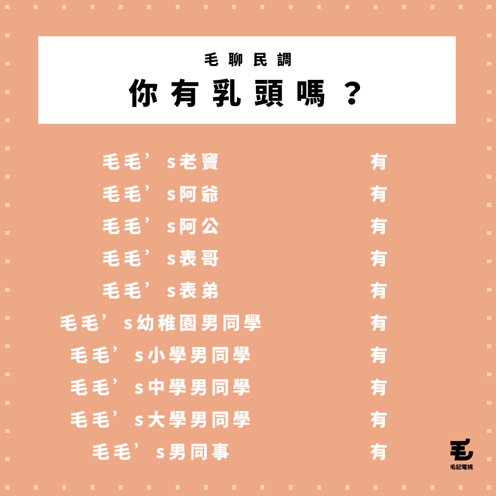 另外,聽講耐唔耐都會有傻豬豬問雄性貓貓有冇乳頭呢個問題,有見及此,毛毛都即時做咗一次好深入嘅電話訪問,調查結果如下: