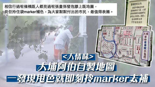 不過,因為呢啲地圖係用發泡膠同marker整成嘅,所以用得耐都會甩色,有時仲會畀手多嘅人整爛?。而最近,又有大埔人見到伯伯喺度用marker補色喇……