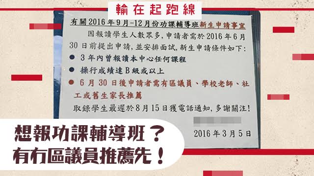 其實小朋友都係成績唔好,喺起跑線輸咗,先要上功課輔導班啫,點知連想中途發力都要推薦信先得,連報個補習都失敗……唉,人生。