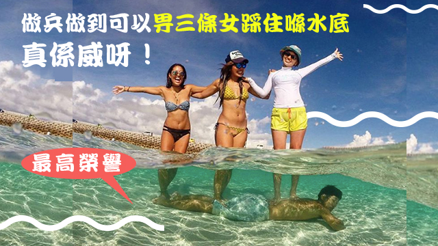 佢可以喺宮古島玩個靚水不但止,仲得到做兵仔嘅最高榮譽……就係可以畀女神踩住喺水底!btw,留意返,佢仲要係一次過畀三個女女踩住㗎~咁咪即係一次過有三倍享受?