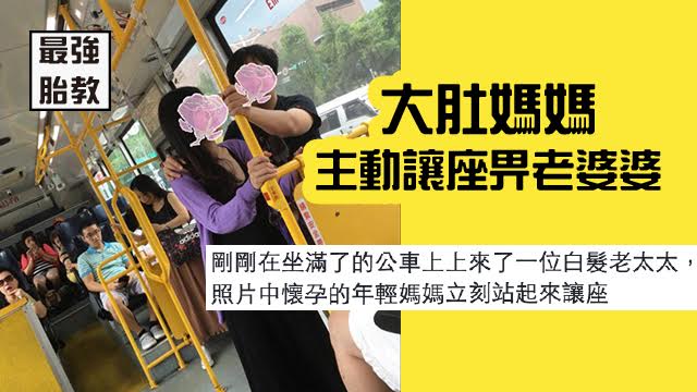其實搭車見到有人讓座好common啫~不過今次堅係抵讚㗎,因為個主角係一個大肚媽媽呀!大肚媽媽見到有個老婆婆上車之後,竟然立馬企起身讓座畀佢。佢仲要明明仲有幾個站先落車,唔係下個站就到先做個順手人情㗎~呢個媽媽嘅胎教唔係淨係聽下莫扎特咁簡單,而係親身敬老,真係超抵讚!