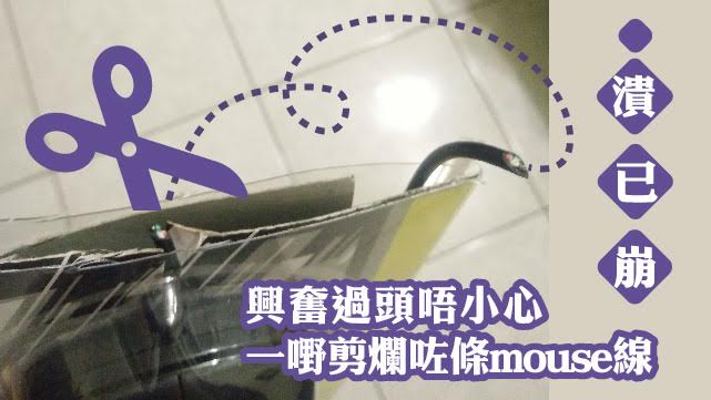 親眼見證同學剪爛條睡褲,係就係好震撼心靈,但相信都唔夠見到呢個畫面咁崩潰!呢個傻豬豬網民開開心心咁買咗隻新mouse返屋企之後,梗係立馬搵把鉸剪出嚟拆開個包裝啦~佢話剪剪下覺得卡住卡住有啲難剪,不過一樣無礙佢嘅興奮心情,一於大大力咁剪落去啫!點知,原來佢一嘢剪爛咗條mouse線……相信呢隻會係史上壽命最短嘅mouse。