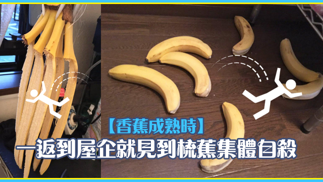 咦,說好的香蕉呢?點解得返啲蕉皮嘅喂?是咁的,話說有位日本網民就將梳蕉掛咗喺屋企,然後有日佢落街食完飯返嚟,就見到啲蕉集體自殺喇……嗚哇,啲蕉竟然寧願跌落地都唔想畀佢食落肚,唔通連啲蕉都唔鍾意佢?!
