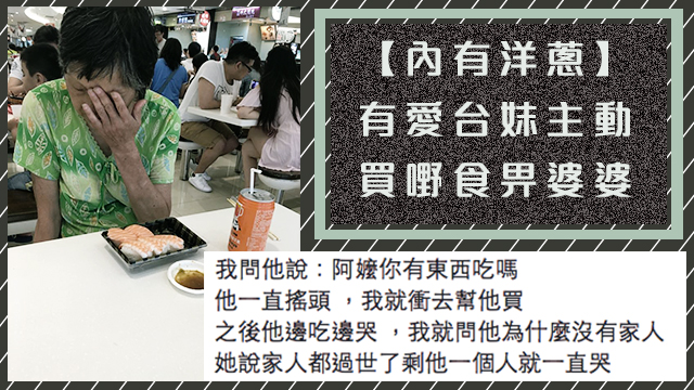 是咁的,話說最近有位台灣妹豬喺商場食嘢嘅時候,見到一位婆婆係咁望住佢啲嘢食……咦,唔通婆婆覺得肚餓但又冇錢買嘢食?咁要幫幫婆婆先得喎。