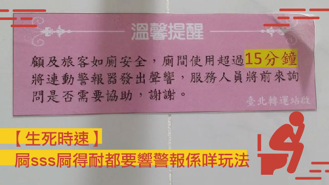 有台灣網民喺客運站見到呢張告示,個菊花即刻緊一緊,嚇到原條縮返入去……喺廁格入面逗留超過15分鐘就會響警報係咩玩法?仲話到時會有服務人員嚟,喂都係想屙個sss啫,唔使畀咁大壓力下嘛?