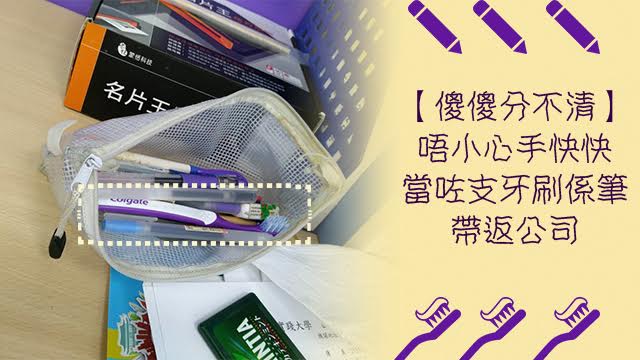 呢個懵豬豬咪就係傻下傻下嘅好例子囉。佢有一晚諗住刷牙瞓覺嘅時候,就搵嚟搵去都唔見支牙刷喺邊,吖唔通佢有腳識走咁得人驚?!咁都唔係最驚呀,最詭異嘅係,第二日有同事問佢借筆袋用嗰陣,先發現原來支牙刷靜雞雞走咗入去筆袋度匿埋……