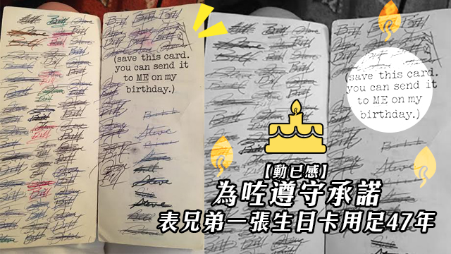 其實係因為呢兩個表兄弟喺細細個嗰陣就約定咗每年都要用同一張生日卡同對方講生日快樂,每送一次就要喺上面簽名認證!嗚哇真係好有愛,可以搵到一個肯同你一直咁樣樣癲落去嘅人,真係好難得。能夠互相守候對方咁多年,唔係叫做愛係咩吖你話嗱!