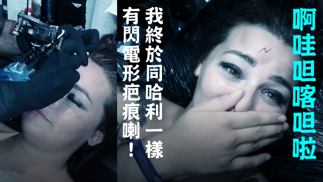眾所9知,哈利波特額頭上嘅閃電疤痕,其實係佛地魔用索命咒攞佢命嗰陣唔小心咒語反彈而造成。所以,如果大家想要條一模一樣嘅閃電疤痕嘅話,就應該得佛地魔先做到。不過可惜佛地魔一早就去咗賣鹹鴨蛋,所以呢位洋妹豬都係侷住搵個麻瓜紋身師傅頂住當先嘅……