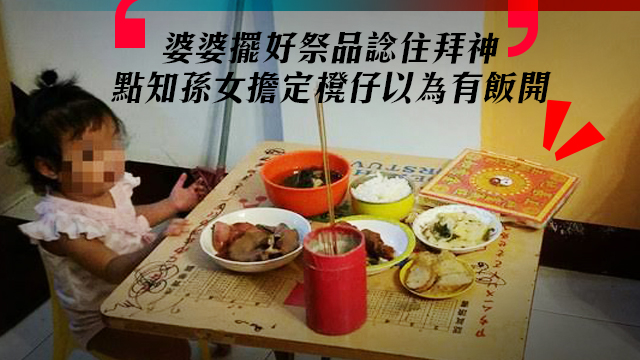 聽講唔少台灣人都有個拜地基主嘅習慣(類似拜土地啲fd),而有台灣網民話自己嘅婆婆都唔例外,一早就準備好香燭同祭品諗住拜地基主喎~點知就喺婆婆擺好晒香燭同祭品嘅時候,呢位得一歲零八個月大嘅小妹妹樂樂就突然擔咗張櫈埋嚟……原來,佢以為而家開飯呀!