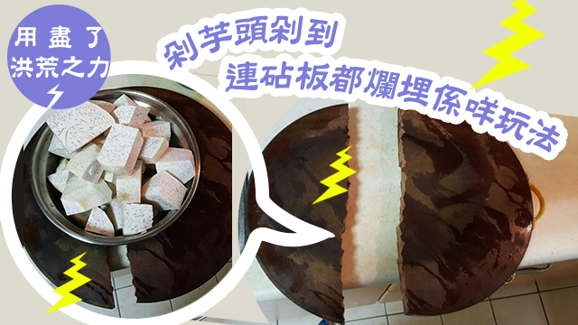 就好似呢個台灣網民咁,睇嚟佢都應該盡得傅園慧洪荒之力嘅真傳喇,事關佢剁個芋頭,都可以搞到成塊砧板咁樣樣裂開一半呀!
