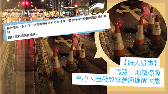 唔好話人行過易kick親啦,好多網友都話揸車嗰陣成日畀呢啲窿窿整到爆軚呀!唉,其實而家連水都含鉛啦,馬路易爛咗又有咩出奇喎!不過好彩香港仲有一班有心人,就好似呢個網友咁,見到條馬路有幾個大窿窿喺上面,就自發咁拎幾個雪糕筒去圍住佢,提醒大家要小心啲呀!