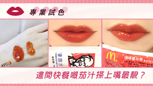 個嘴仔紅卜卜又水嫩嫩咁,真係睇見都想錫佢一啖呀嘻嘻~睇真啲,原來佢搽嘅唔係普通唇膏,而係茄汁嚟呀!有個妹豬用咗唔同快餐店嘅茄汁搽上個嘴仔度,試下邊間嘅茄汁效果最好。佢畀麥記茄汁嘅評語就係「滋潤,持久性差,上嘴磚紅色」喇~