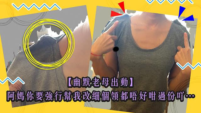 類似嘅事,喺宇宙入面不斷咁發生,台灣有個乖女都有同樣遭遇呀。話說有日佢阿媽好興奮咁迫佢試著件tee睇下啱唔啱身,點知一著上身先知,原來阿媽覺得佢件tee個領太大,所以咪粒聲唔出幫佢縫咗幾針囉……