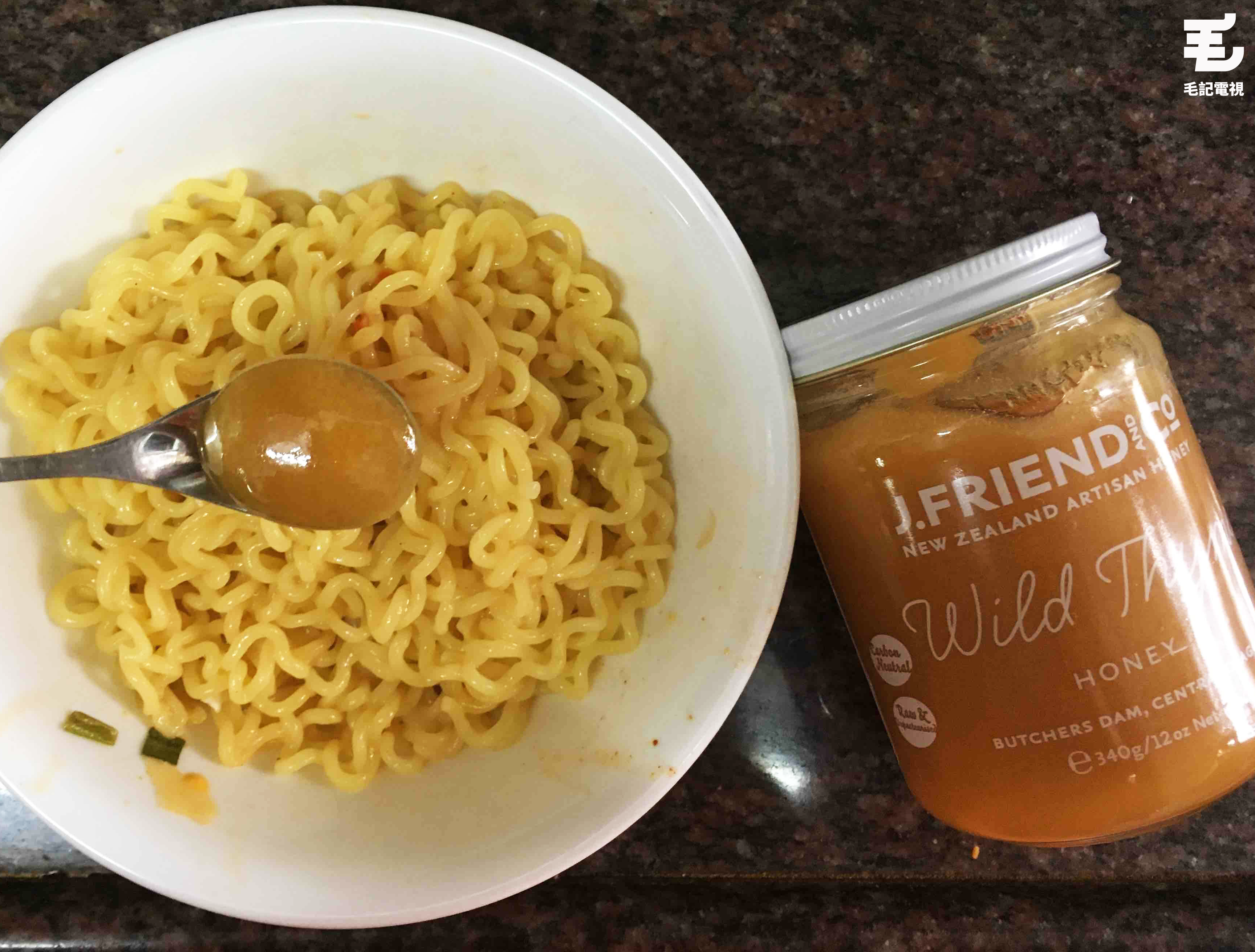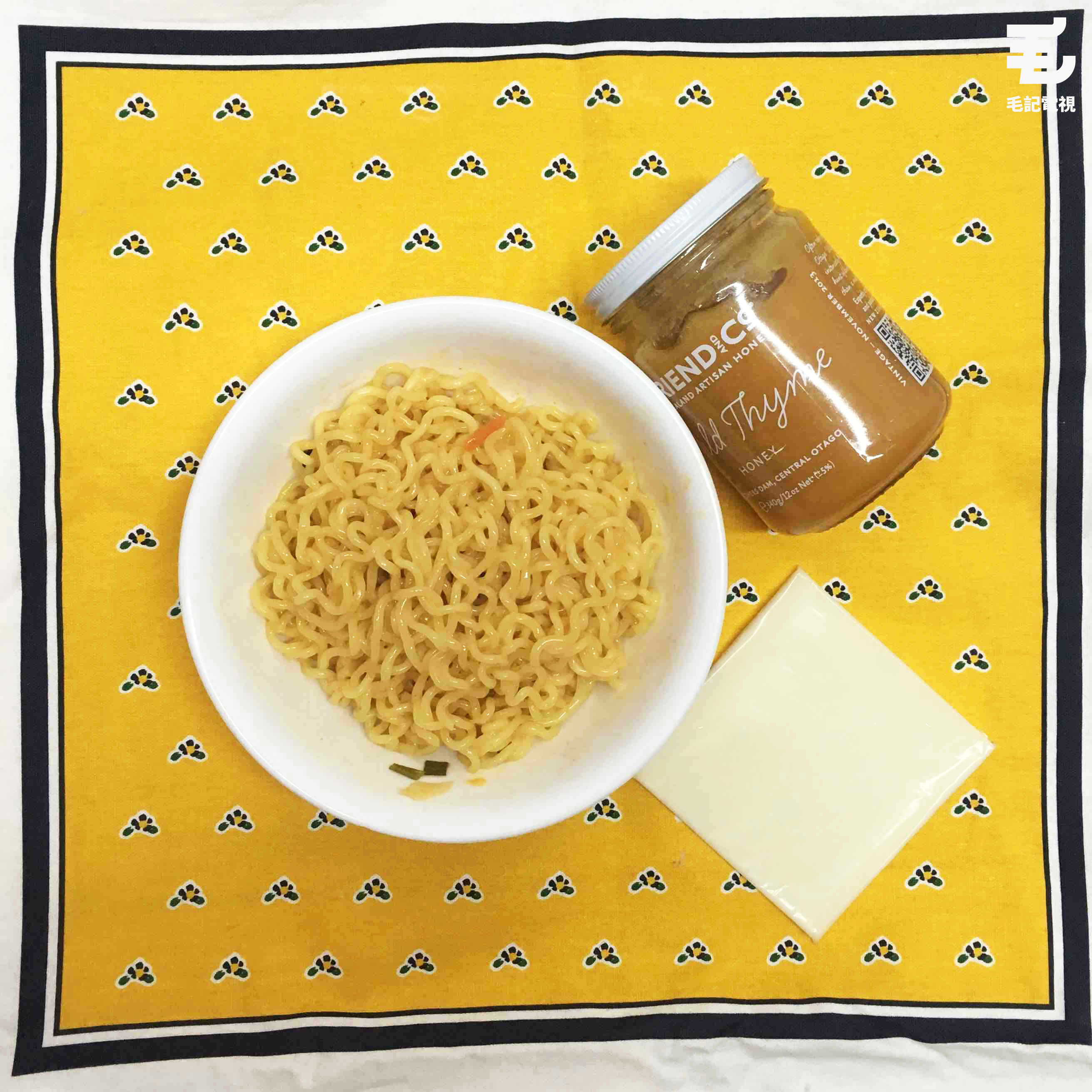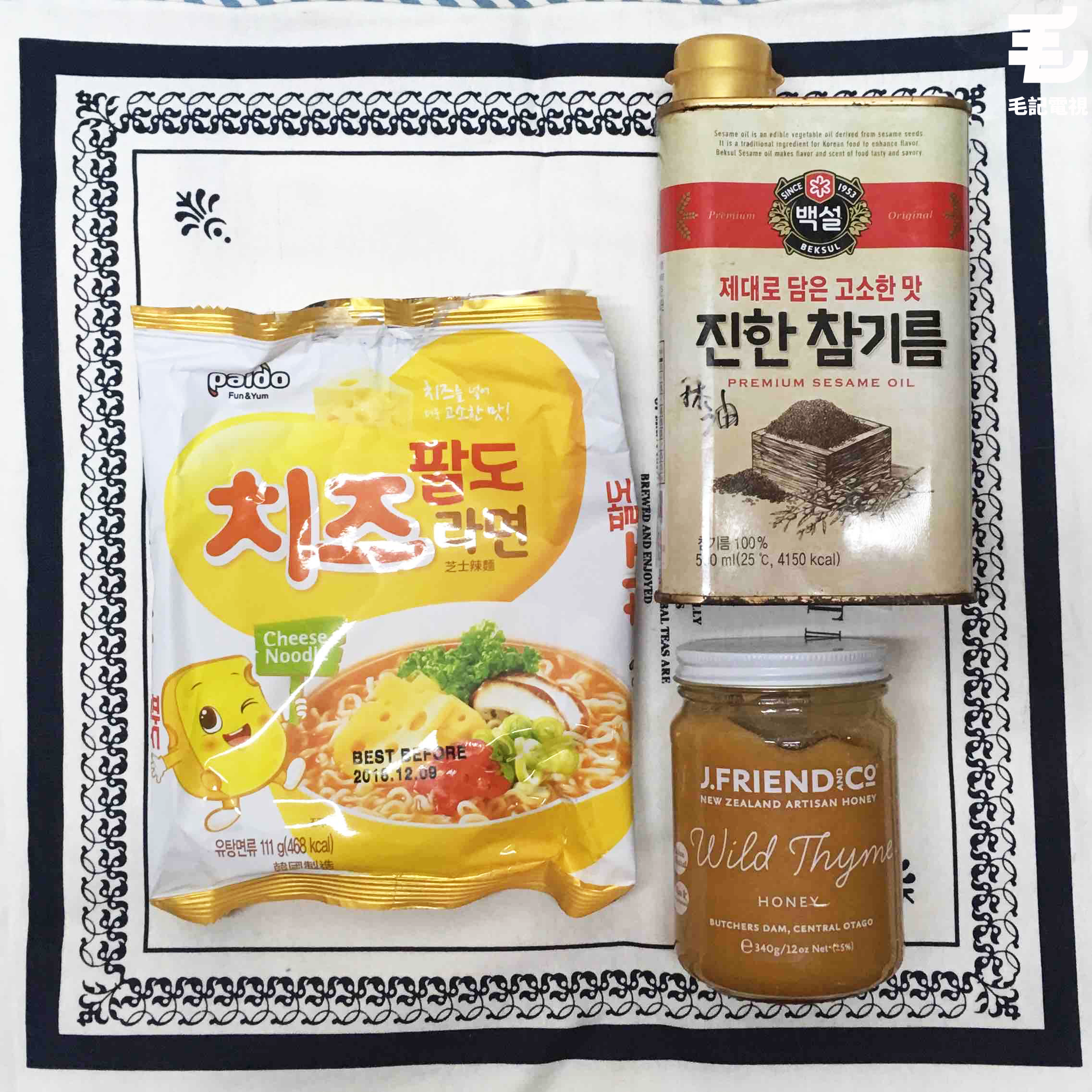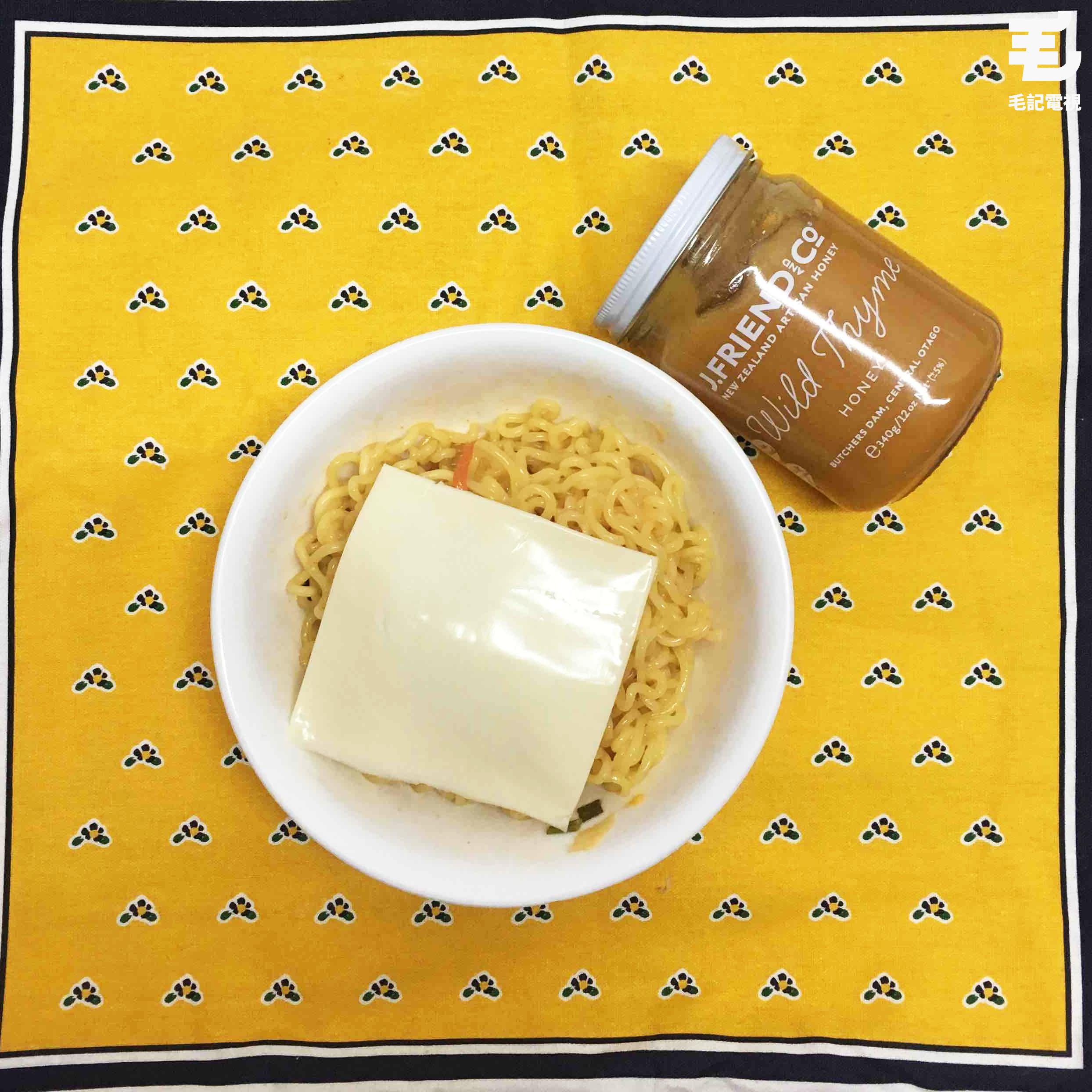 例牌都係講咗要咩材料先啦,話明「芝士撈麵加蜜糖」,就當然要有一包即食芝士撈麵……同埋蜜糖啦。如果屋企有麻油就更好啦~
