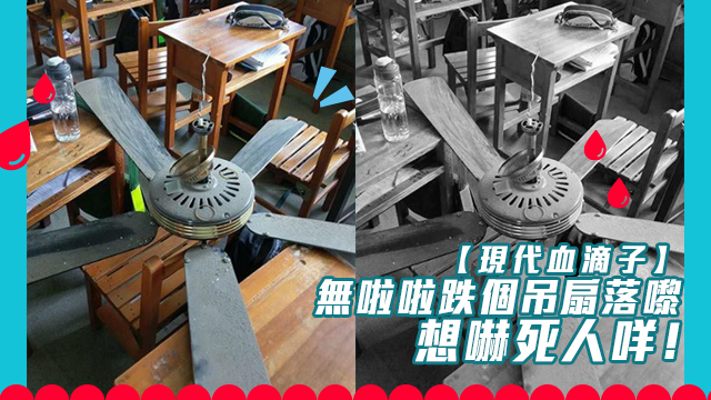 想當年,毛毛讀書嗰陣成日都形住課室天花板上面嗰幾把吊扇會跌落嚟。雖然嗰幾把吊扇直到毛毛畢業都仲係完整無缺,但坐正喺把吊扇下面都係會有啲心驚驚㗎嘛!而最近,有台灣網民就真係捕捉到課室把吊扇跌落嚟嘅一刻喎……各位觀眾,係巨型血滴子呀!