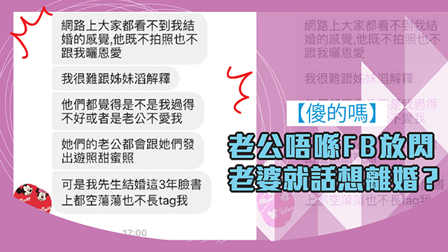 是咁的,話說噚日有位32歲嘅台灣人妻inbox一位台灣網絡紅人「權志龍」,話自己已經同老公結咗婚三年,仲有個1歲嘅囝囝,但因為老公好少陪佢出席姊妹聚會,加上老公份人又比較低調,好少用facebook,呢幾年都冇乜點tag過佢,搞到班姊妹就以為佢哋夫妻關係唔好,所以咪令到呢位人妻想離婚囉!