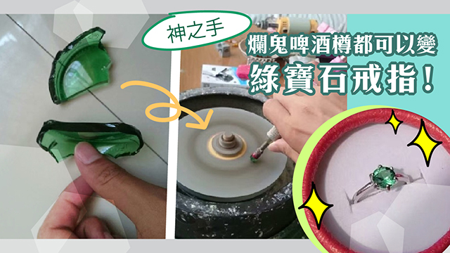 雖然N年前嘅電視廣告都有話:「鑽石恆久遠,一顆永留傳」,但家陣講緊嘅係鑽石,唔係腎石呀,毛毛哪有錢買啫你老_?嗱,除非毛毛好似呢位網民咁有對神之手,識將啲啤酒樽碎片磨到好似粒綠寶石啦,咁就可以輕輕鬆鬆擁有一粒閃令令嘅鑽石嘞!