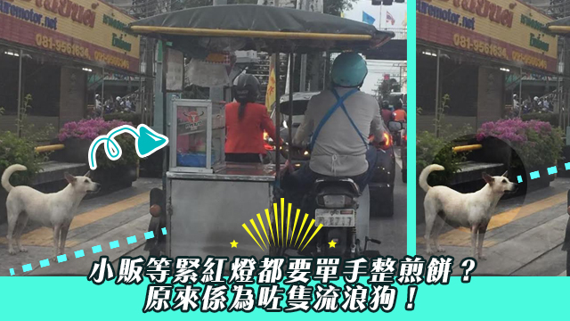 單手做其他嘢毛毛都見得多,但係喺馬路一面等紅燈轉一面單手整煎餅,毛毛都真係第一次見。原來呢個小販見隻狗仔好似好肚餓咁,見等緊燈又冇嘢做喎,咪嗱嗱臨整塊餅畀隻狗仔醫肚囉!