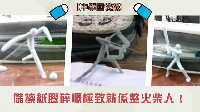 以前啲同學仔儲咗一堆擦紙膠碎,多數都只係搓返埋一粒波,最叻都係用嚟當擦紙膠用,將擦紙膠>擦紙膠碎>擦紙膠碎擦紙膠>擦紙膠碎無限loop,但呢位神一般嘅同學仔竟然當啲擦紙膠碎係紙黏土咁用嚟整火柴人!