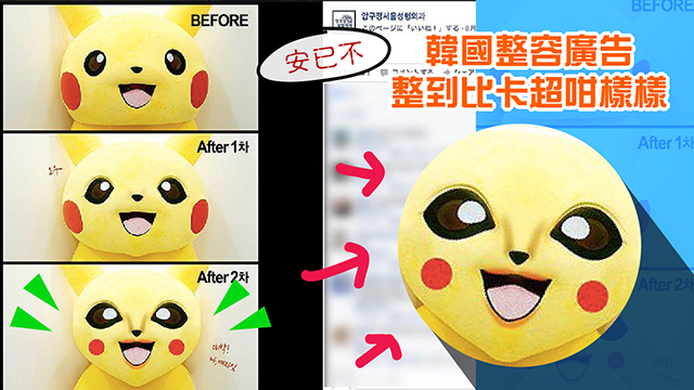 毛毛以為台灣呢隻異形版比卡超已經好崩壞啦,點知真正崩壞嘅比卡超原來喺韓國先啱!話說,一間韓國整容醫院最近就喺facebook出咗個用比卡超做主角嘅post,仲將比卡超嘅無敵包包面一嘢P到變蛇精男V面?……嘩,想嚇死寶寶咩?