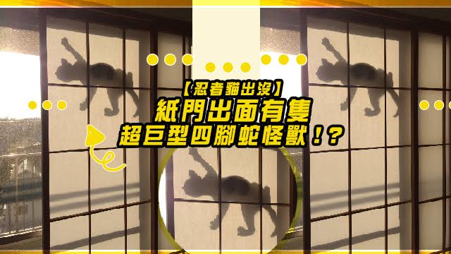 死喇媽咪!屋企道紙門出面有隻超超超巨型四腳蛇怪獸呀!大到成隻貓咁,好彩而家淨係見到個剪影咋,如果見到正面同佢四目交投點算好呀!睇真啲,原來係喵星人嚟呀,好地地爬上道紙門,係咪想做忍者喵太郎呀?