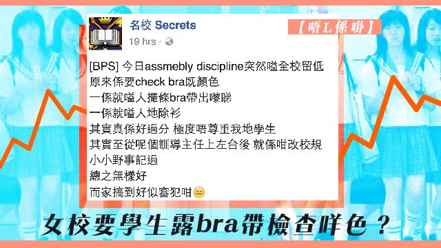 夏季校服太薄太透,好容易透咗內衣顏色出嚟,所以唔少學校不明文規定女同學要著白色胸圍同打底嘅,即係就算校規唔寫,老師都會另外同女同學講㗎。最近就有自稱係庇理羅士女子中學學生嘅網民喺網上話,學校喺早會之後無啦啦要檢查同學嘅bra帶顏色,仲要「一係攞條bra帶出嚟睇,一係除衫」!唔係啩,會唔會第日要check埋底底咩色㗎?