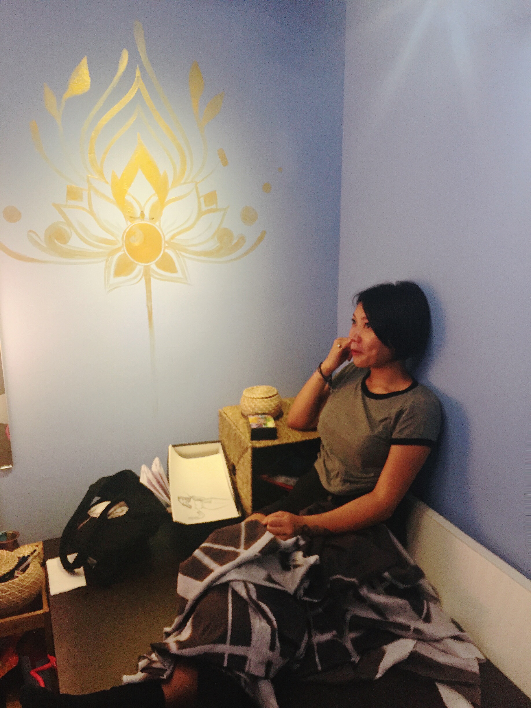 自我反省過後,天茵決定唔可以再廢落去,決定擺街檔。用一個星期準備橫額、一百多張圖板,夜晚喺蘭桂坊擺檔幫人畫Henna,勉強維持自己嘅生活。