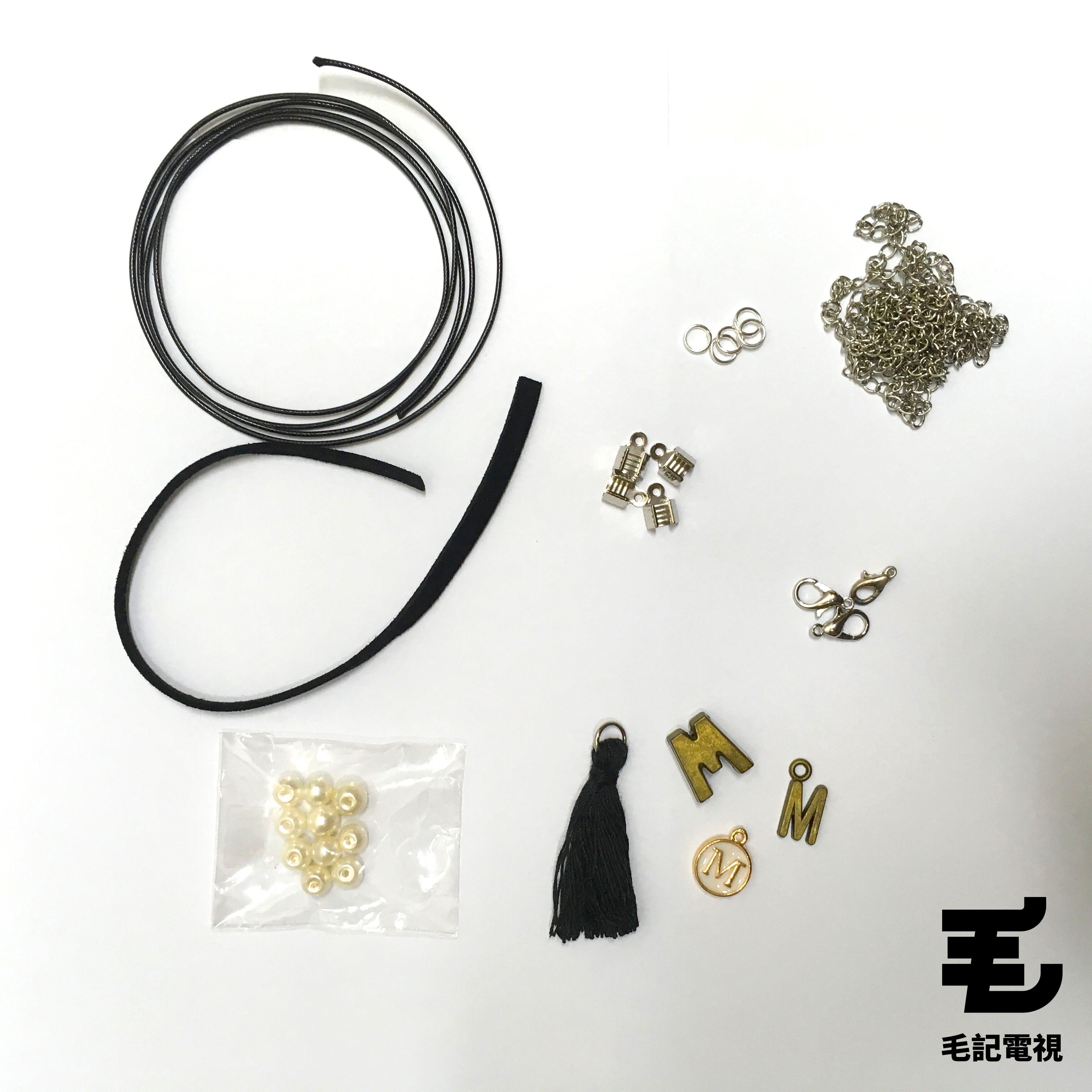 要做一個型女,首先你要有……粗幼唔同嘅皮繩、繩夾2個、圈圈2個、龍蝦鉗1個、銀鍊。粗嗰條皮繩係最貼住條頸嘅,長度啱啱好可以圍住條頸一個圈就ok,大約係33cm,幼皮繩就可以加返3cm,留意粗皮繩同繩夾闊度要買返一樣呀,毛毛買嘅係5mm。另外當然仲要準備一款你鍾意嘅吊墜或者珠仔啦!