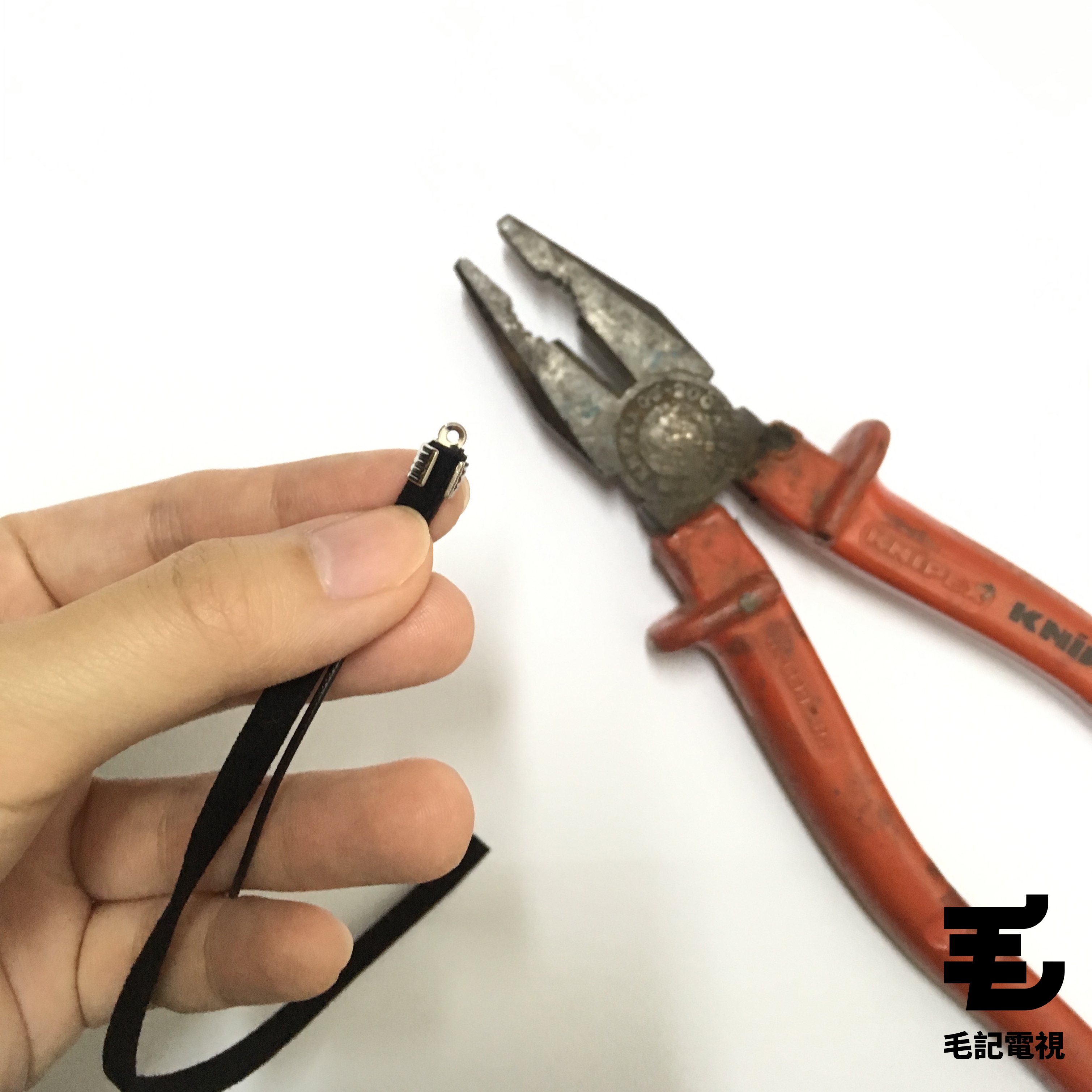 首先將兩條皮繩其中一頭疊埋,用繩夾夾實。(毛毛知個鉗係大咗啲,唔好意思囉……)