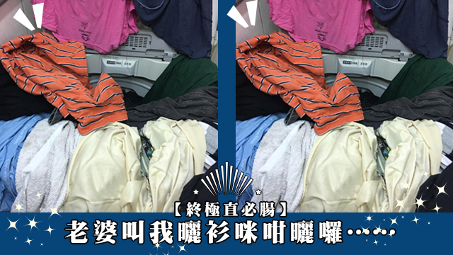個老公將啲衫舖晒喺部洗衣機上面就當係曬衫呀…咁又冇錯喎,佢老婆叫佢曬衫又冇話要喺邊度曬,而家只不過係少咗啲風、又冇陽光,啲衫難乾啲咋嘛!畀一個月時間佢啦,應該一個月後就會乾㗎喇!……如果個老婆仲未發嬲,個男人仲有命睇到啲衫乾嘅話。你知啦,古乳有暈,寧得罪小人,莫得罪女人吖嘛!女人發起惡上嚟分分鐘會世界末日呀!