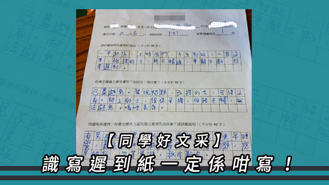 下,遲到原因呢家嘢,唔係塞車就遲起身㗎啦,點吹到110個字出嚟呀?唔通真係寫扶阿婆過馬路咩……喂,你哋就話冇墨水啫,人哋呢位同學仔好好文采,句句都諗過度過先寫㗎!唔信你哋睇下嘞: