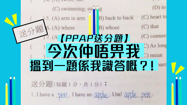 是咁的,話說最近有台灣網民就post咗自己份英文試卷嘅送分題出嚟,仲話「終於有我看得懂的題目了」?,原來呢條所謂嘅送分題就係問《PPAP》嘅歌詞呀!I have a pen~I have an apple~好彩呢位網民有畀《PPAP》洗腦啫,如果唔係就蝕咗1分㗎喇。