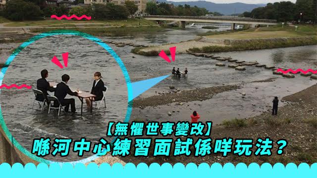 不過睇真啲,佢哋個背景咁怪嘅喂?原來佢哋竟然喺條河度練習面試?!對腳仲要浸晒水,又濕又凍都專心到答面試官問題就當你贏!咁都頂得順,到真正面試嗰時喺舒舒服服嘅冷氣房就自然冇得輸啦!