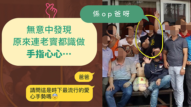 老老77,其實擺pose都係一門學問嚟……你哋見啲model次次影相都又「頭痛」又「腰痛」呀咁,就知道擺pose笨唔係一件容易嘅事嚟啦!而講到擺pose,呢位台灣網民嘅阿爸都唔弱,一把年紀嘅佢竟然識得做呢個韓國oppa必做嘅手指心心手勢喎!