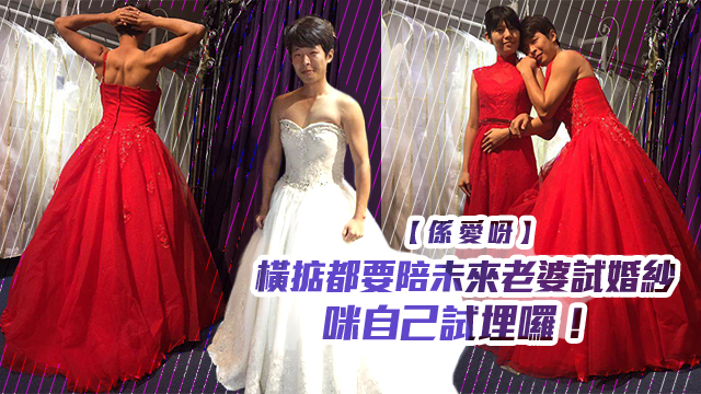 吖,毛毛以為呢位準新郎哥係話自己等未來老婆大人等到悶,自己都忍唔住走去試禮服啦,點知原來佢係講緊自己都忍唔住去試婚紗……um,結實嘅背肌喺紅色晚裝嘅襯托底下,啲膚色又係顯得幾紅粉菲菲嘅。