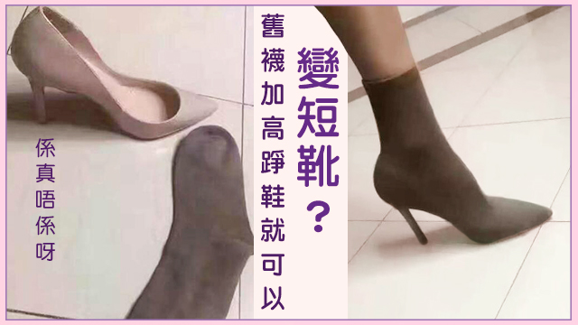 然後你就可以著完高踭鞋再著襪,跟手用力一拉,再用個鞋踭踩穿對襪……登登登櫈,一對修腳型嘅短靴就咁就完成咗嚕!