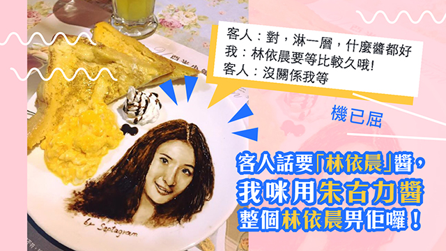話說有客人就order咗份多士,咁佢諗住叫店長幫佢淋多層醬啦,點知呢位店長就唔小心將「淋一層」聽錯做「林依晨」(留意返,係用國語讀),然後咪用朱古力醬畫咗個相似度高達90%嘅林依晨出嚟畀佢囉!一齊睇下~