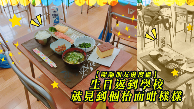 是咁的,呢個壽星女本身諗住今年生日淨係會收到啲糖呀卡呀呢啲行嘢做禮物,點知一返到去學校,就見到自己枱面放咗呢幾碟好似九大簋咁樣樣嘅餸菜喺度喇!