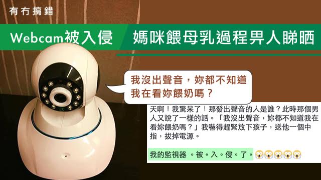 就喺上星期四,佢好似平時咁坐喺床上面抱住BB餵哺母乳,而大女就坐喺佢隔籬睇電視。個cam突然傳咗把男人聲出嚟喎,但係因為個電視太嘈所以佢聽唔清楚講咩,仲同大女講:「爸爸同你講嘢呀」,之後又對住個cam話自己聽唔清楚,叫佢講多次。點知呢個時候,個cam竟然話「我唔出聲你都唔知我喺度睇你餵奶咩?」媽媽嚇一嚇,立馬用紗布巾遮返住胸部先,再打畀老公問下佢有冇用cam睇佢哋,但老公都話冇呀!