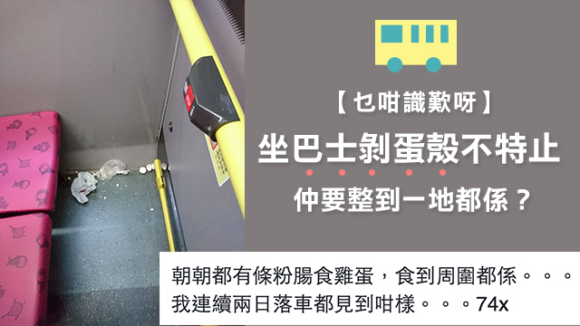 有大埔街坊搭巴士出觀塘嗰陣發現,架巴士居然一地都係雞蛋殼,仲要連續兩日都係咁呀!雖然話風吹雞蛋殼,財散人安樂啫,但係做人冇公德心成咁,真係會安樂咩?
