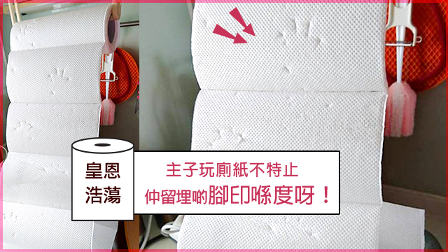 老老竇竇,計毛毛話,使乜買咁多咩玩具畀主子吖!你睇下,呢隻喵星人連廁紙都玩一餐,仲留晒腳印喺上面?呀!